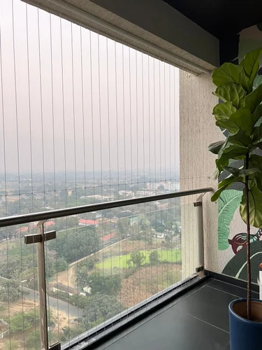 An invisible grill is a safety system made using thin yet strong stainless steel wires (usually 2–3 mm thick) installed vertically or horizontally across the balcony area. These cables are fixed to aluminum frames with proper tension to create a secure barrier while appearing almost invisible from a distance.